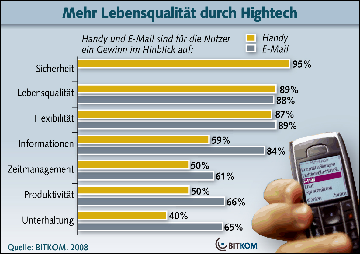 | 1. | Welk percentage mensen vindt dat ze meer doen door de mogelijkheid van e-mailen? | | 2. | Welk percentage mensen vindt dat een mobiel hun leven veiliger maakt? | | 5. | Welk percentage kinderen kijkt nog steeds video en geen DVD? |